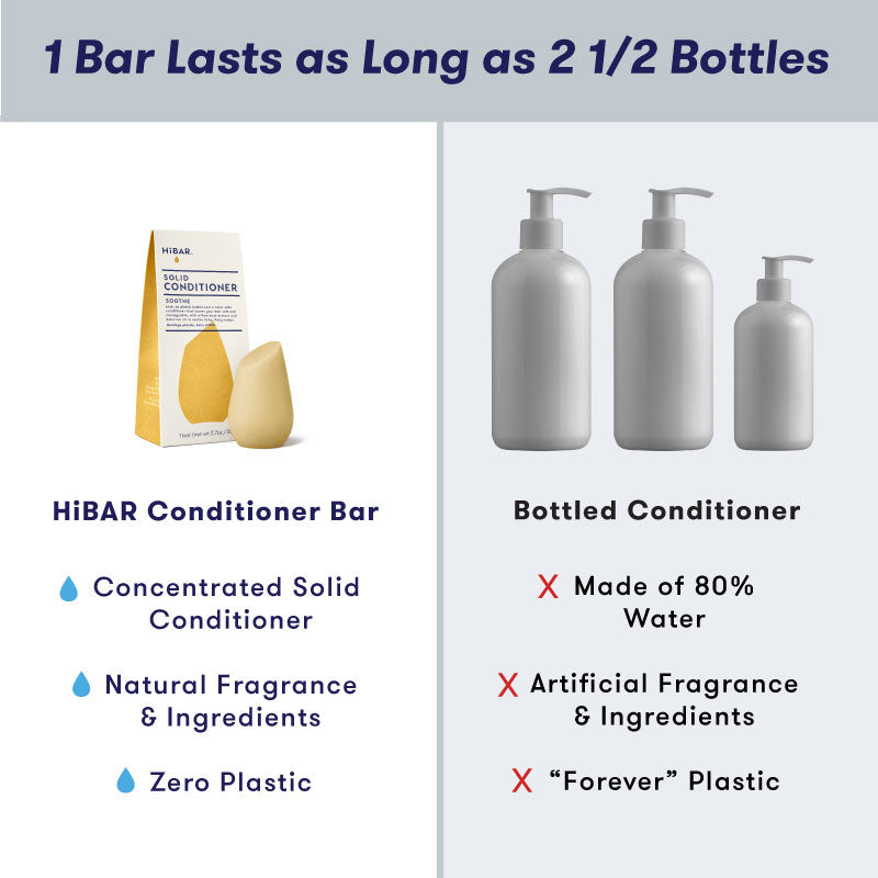 The unique shape of HiBAR Conditioner Bars is designed to fit comfortably in your hand for easy use. And don’t be fooled by the compact size—each conditioner bar lasts as long as 3 big plastic bottles of liquid conditioner.